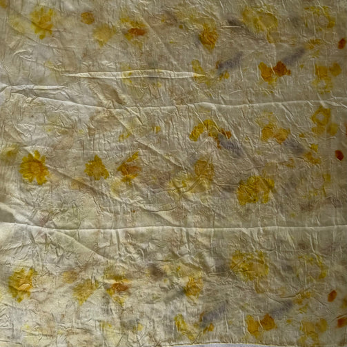 The IRO silk scarf (55 × 55 cm) is naturally dyed using margarita flowers and onion skin through a steaming bundle-dye process.