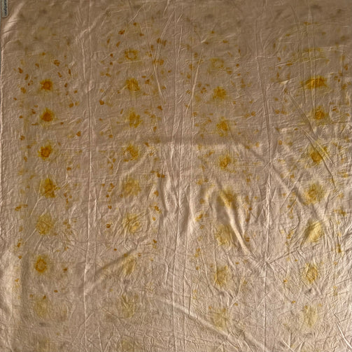 The MOMO silk scarf (90 × 90 cm) is naturally dyed using an avocado–rose–toned background, layered with yellow margarita flowers and onion skins through a steaming bundle-dye process.