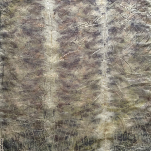 This small silk scarf (55 × 55 cm) is naturally dyed using hibiscus petals through a steaming bundle-dye process. Soft botanical impressions emerge organically, making each piece truly one of a kind.