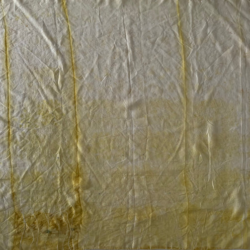 The YŪ silk scarf (90 × 90 cm) is naturally dyed using fig leaves and summer flowers through an immersive bundle-dye process.